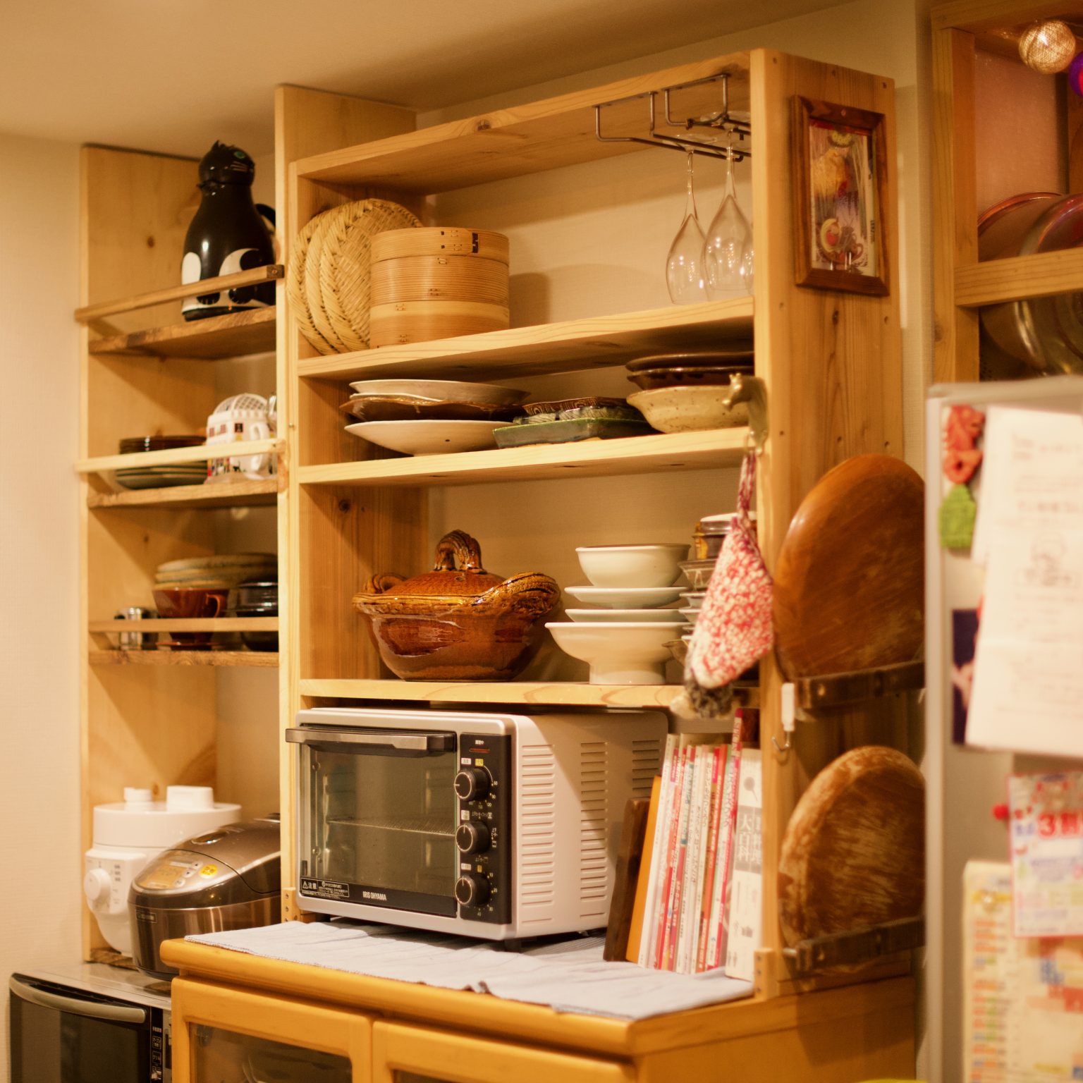 A few years ago I built a wooden dish shelf behind the kitchen, complete with options for hanging trays, steam...