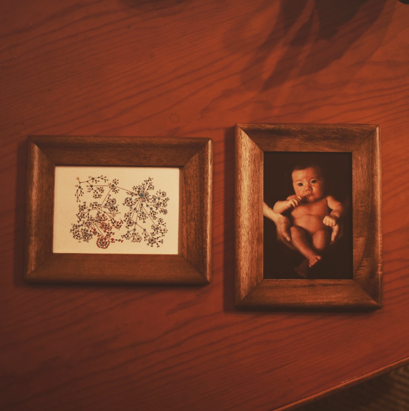 This piece preserves an umbilical cord — the symbol of a baby’s connection to the mother — by sealing it in UV...
